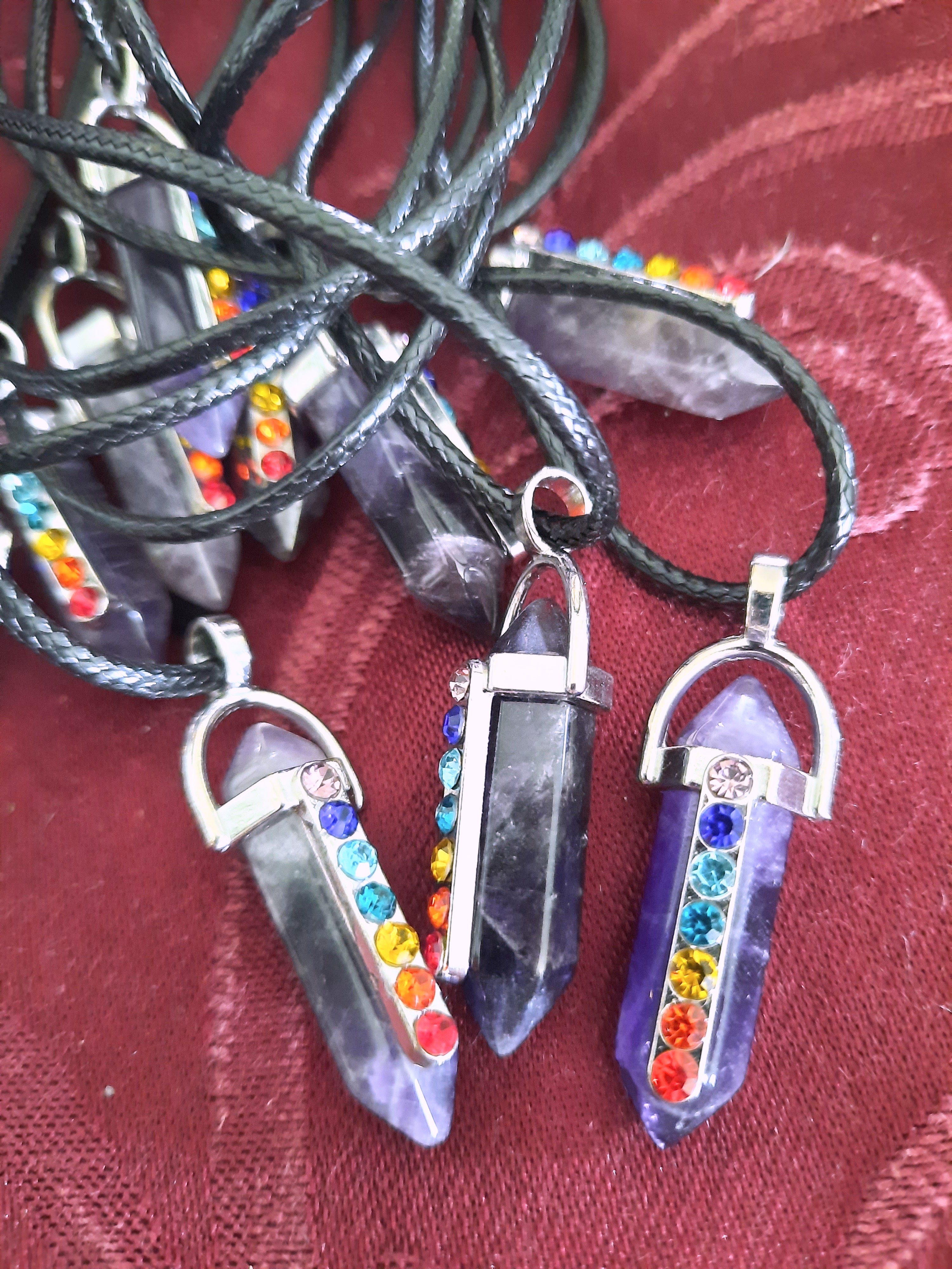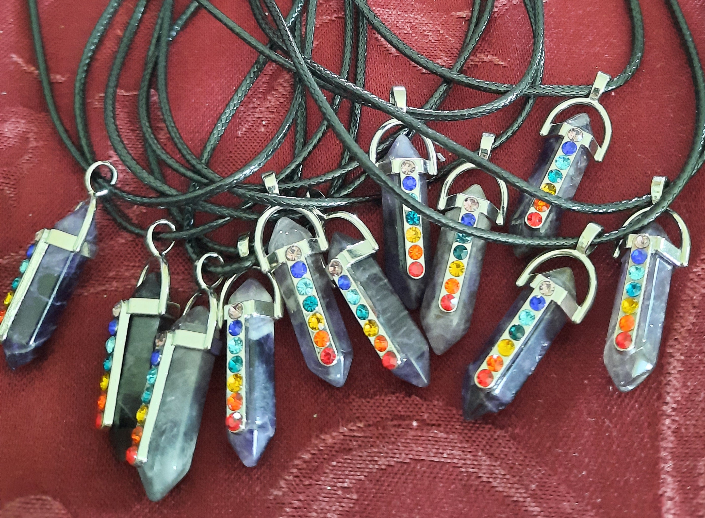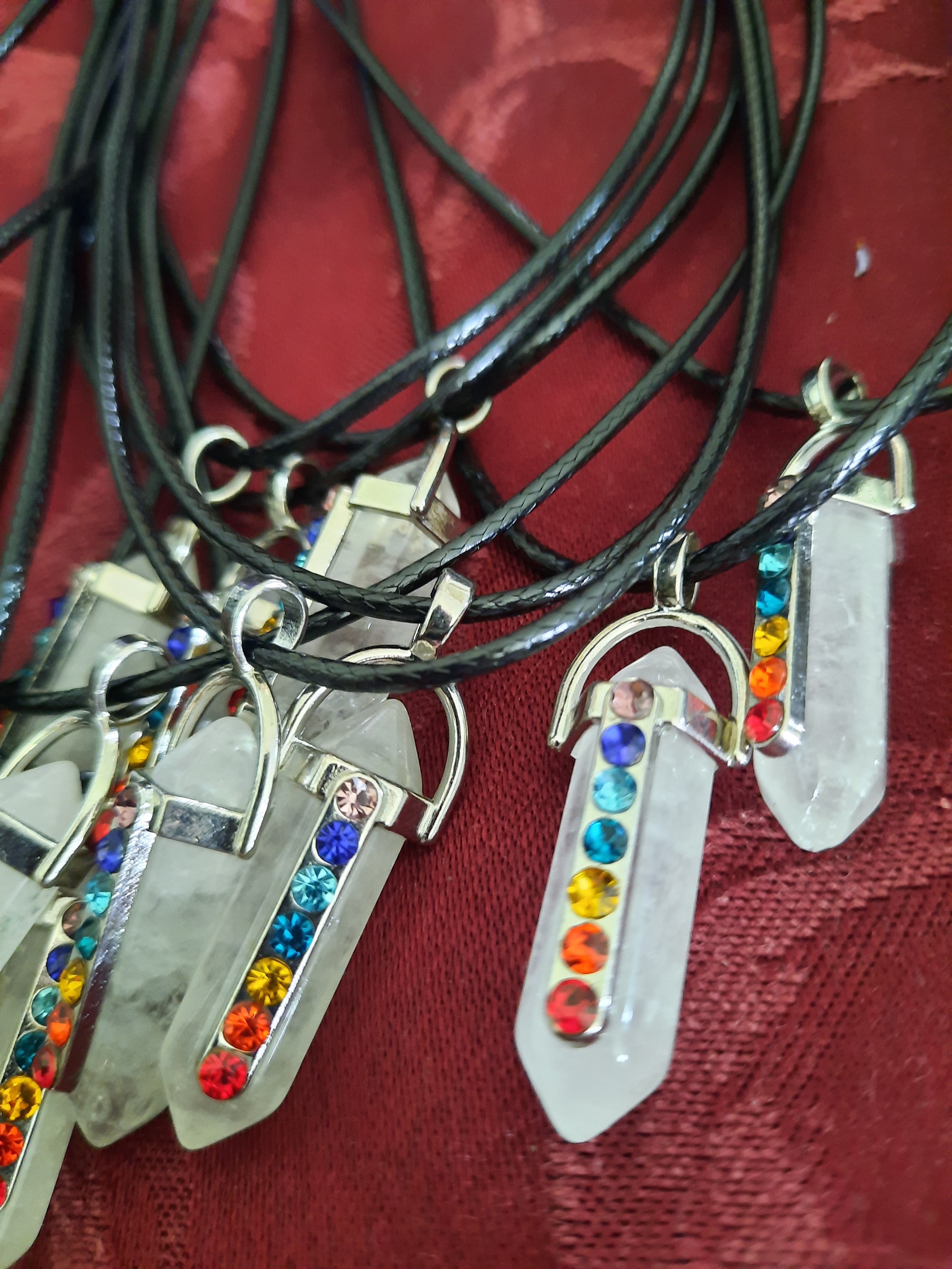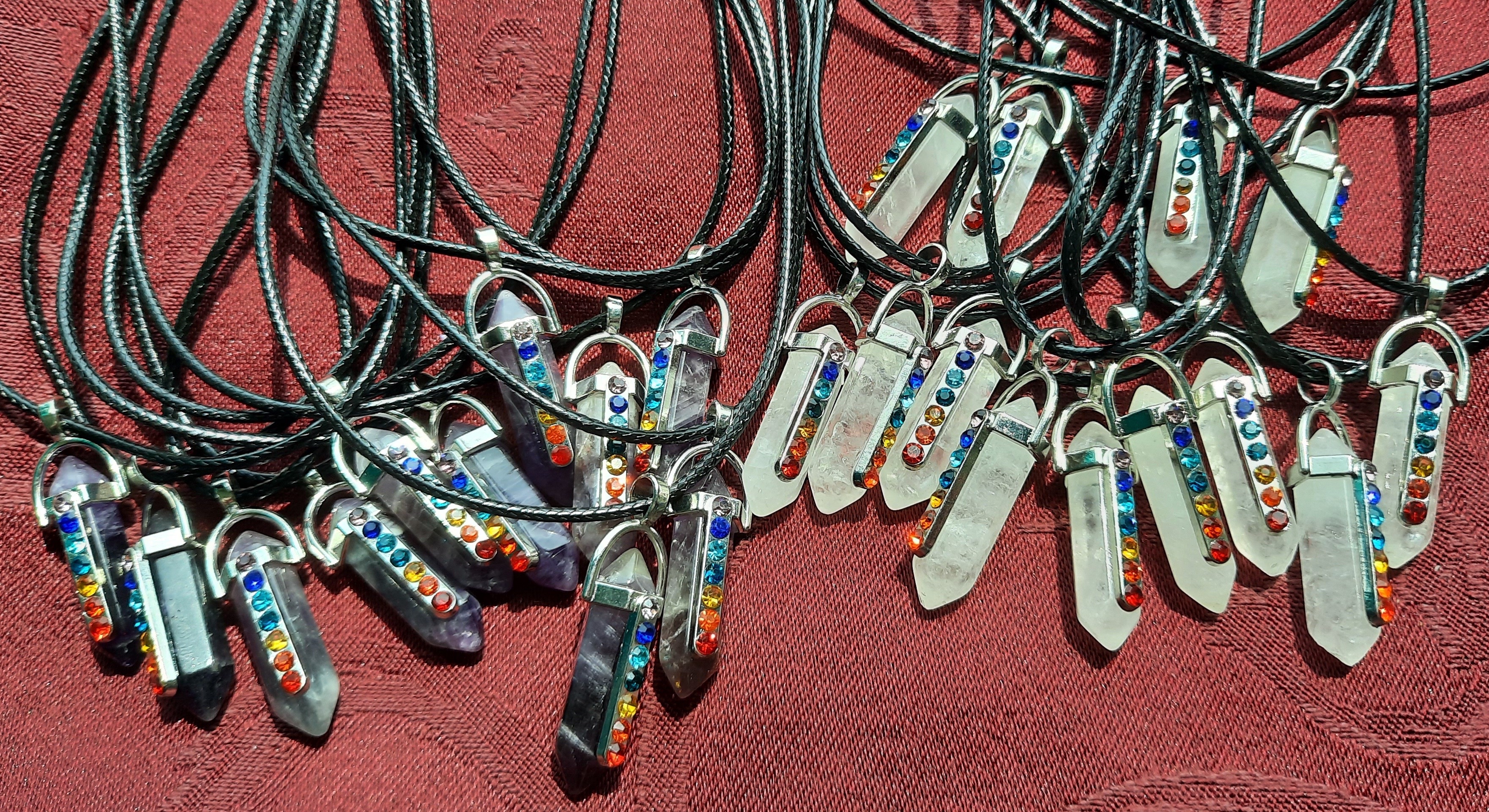 Carved crystal point in a silver-tone hexigonal hanger with Swarovski-style crystal embellishments in the Chakra colors. Available in Quartz or Amethyst.